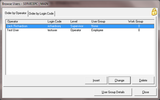 The list takes the form of a spreadsheet, with the Operator names on the left, and the access rights on the right. By simply double-clicking on the displayed rights, access can be changed from Yes to No. Closing the screen is done by clicking on the Close button.